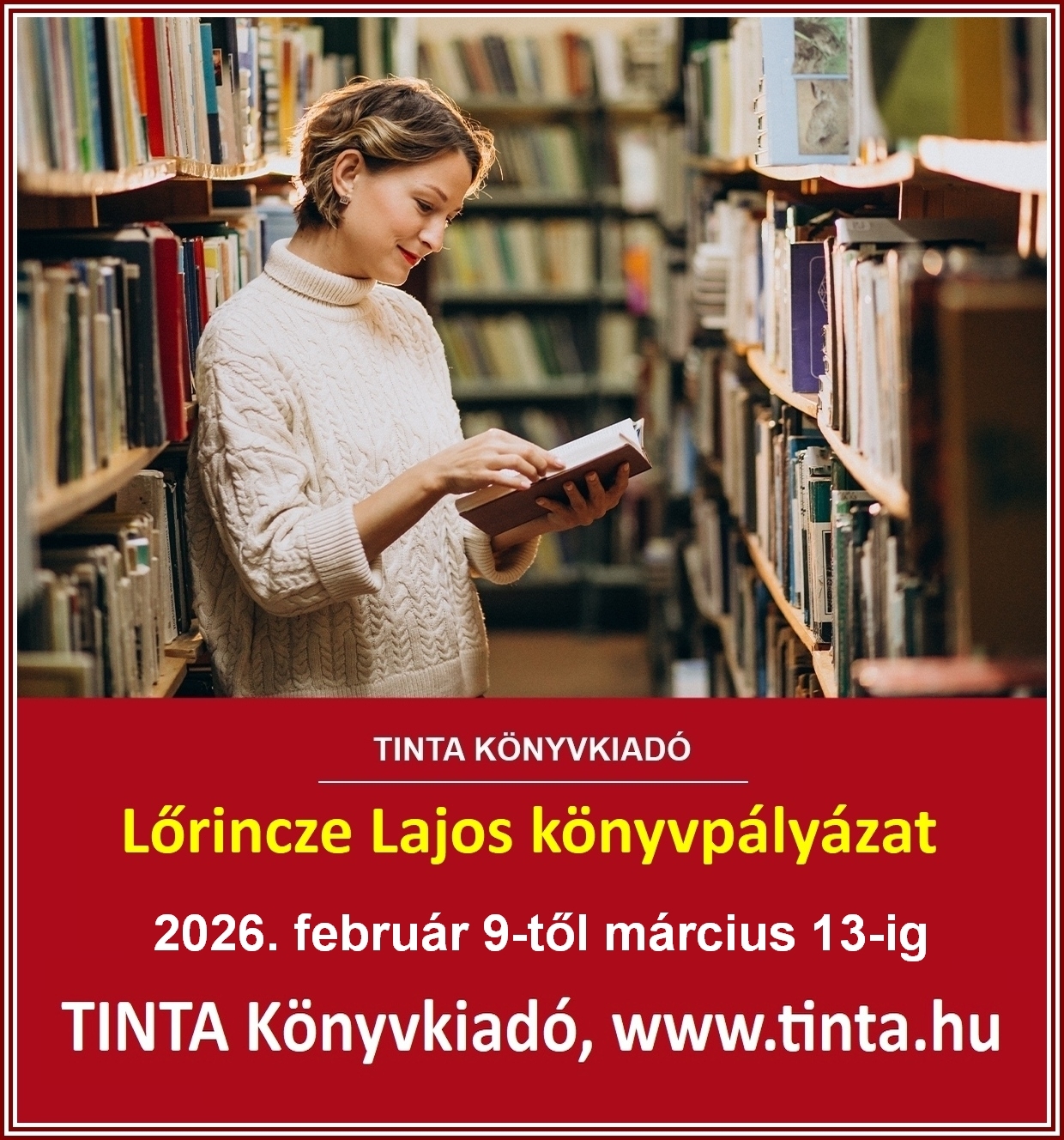 Pályázatot hirdet a TINTA Könyvkiadó Lőrincze Lajos könyvpályázat 2026 címmel könyvtárak bővítésére. A pályázat keretében könyvtárak gyarapíthatják féláron könyv- és szótárállományukat. A pályázaton könyvtárak, valamint alsó-, közép- és felsőfokú tanintézetek, az intézetek alapítványa vagy fenntartója vehet részt. Az elnyerhető támogatás összege legalább 20 ezer, de legfeljebb 200 ezer forint. A támogatásra szánt keretösszeg 3,5 millió forint. A pályázattal kapcsolatos további tájékoztatás a TINTA Könyvkiadó honlapján érhető el.