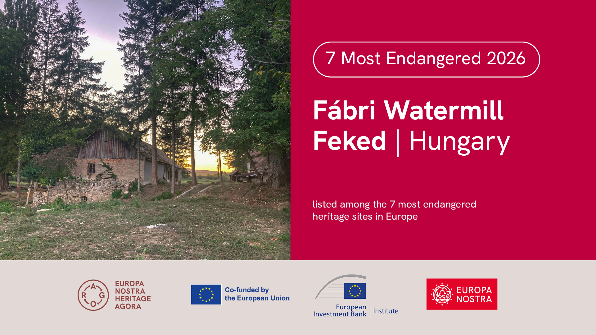 Közzétette az Europa Nostra A 7 legveszélyeztetettebb örökség (7 Most Endangered) helyszín listáját. 2026-ban a veszélyeztetett európai örökség helyszínek listájára Katapola falu és Minoa ókori városa (Görögország), a Blower Hall (Luxemburg), a Chambray erőd (Málta), a Vale de Milhaços Lőporgyár (Portugália), Őraljaboldogfalva református temploma (Románia) és a Weifert sörház (Szerbia) mellett a fekedi Fábri malom is felkerült.